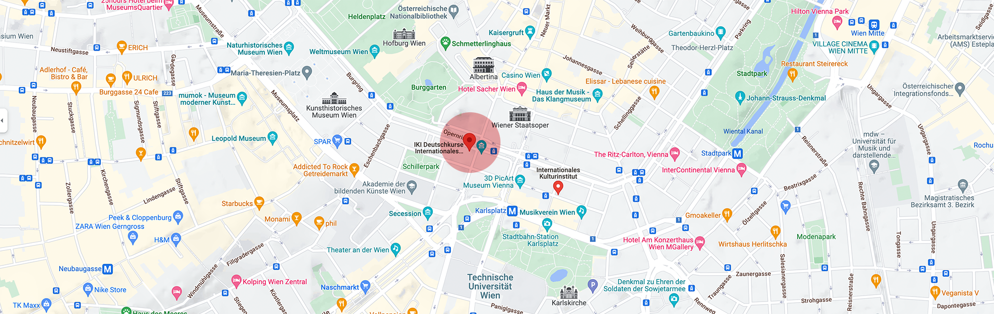 Die IKI Language Academy Vienna befindet sich direkt an der Ringstraße gegenüber der Wiener Staatsoper. Von unserer Sprachschule spazierst du in wenigen Minuten zu den Hot Spots der Stadt wie dem Wiener Naschmarkt, der Kärntnerstraße, dem Graben, dem Stephansdom oder zu den vielen berühmten Wiener Kaffeehäusern in der City.