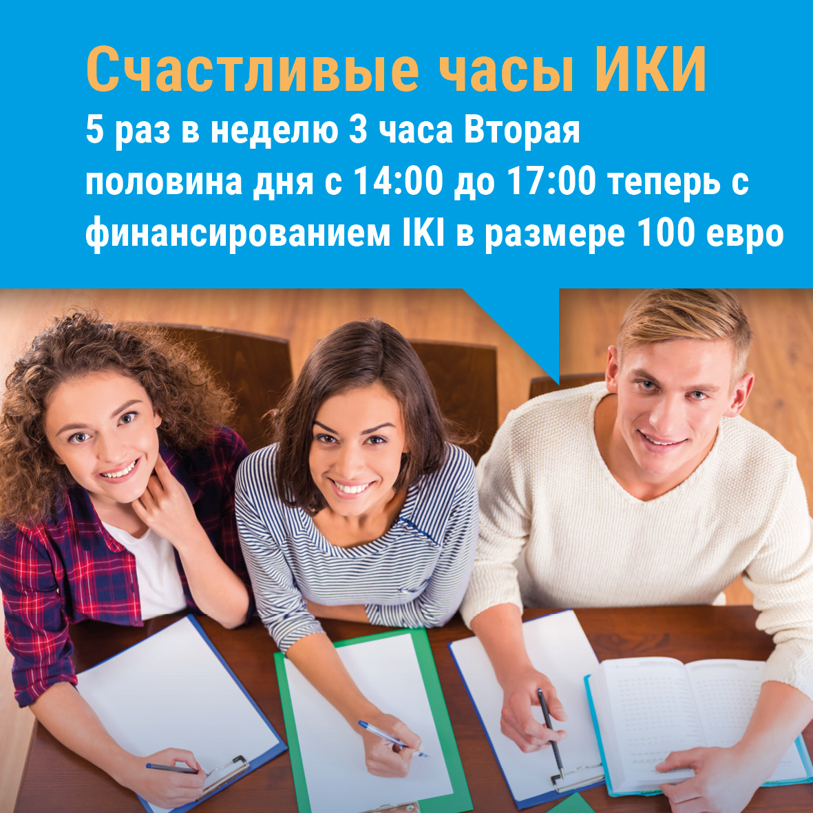 Благодаря программе IKI Happy Hours ты приобретешь наш курс по изучению немецкого языка, который проходит во второй половине дня, по особенно выгодной цене.